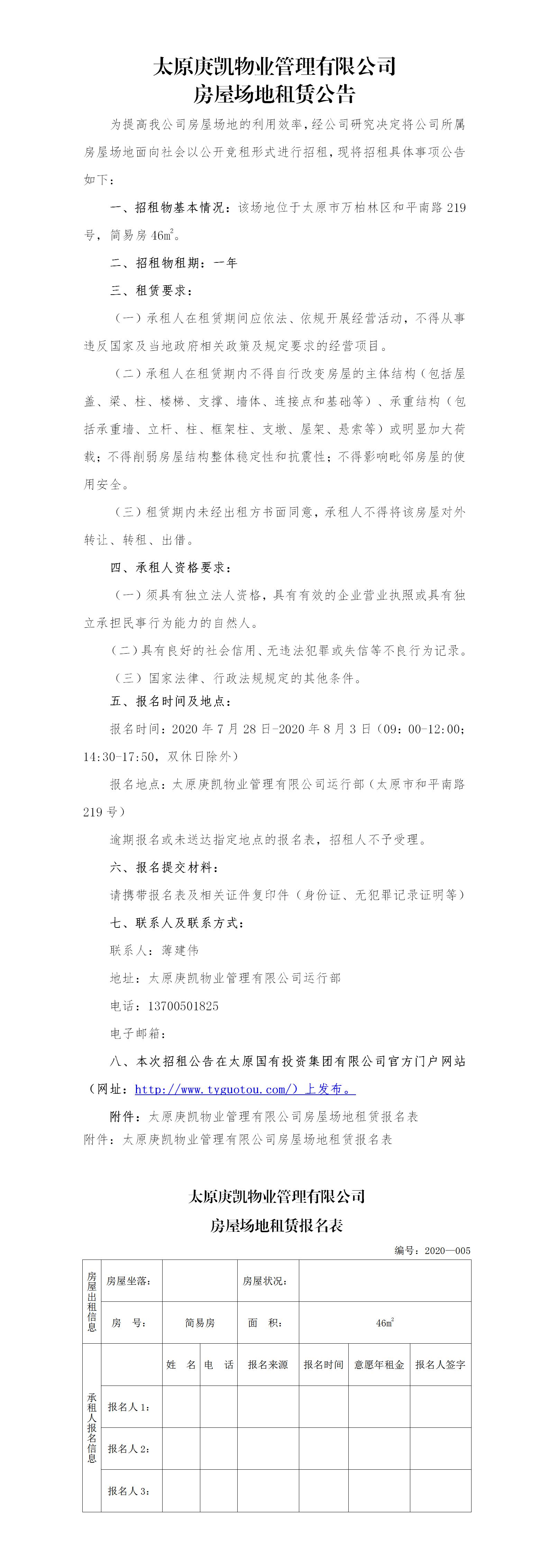 太原庚凱物業(yè)管理有限公司房屋場地租賃公告(五)