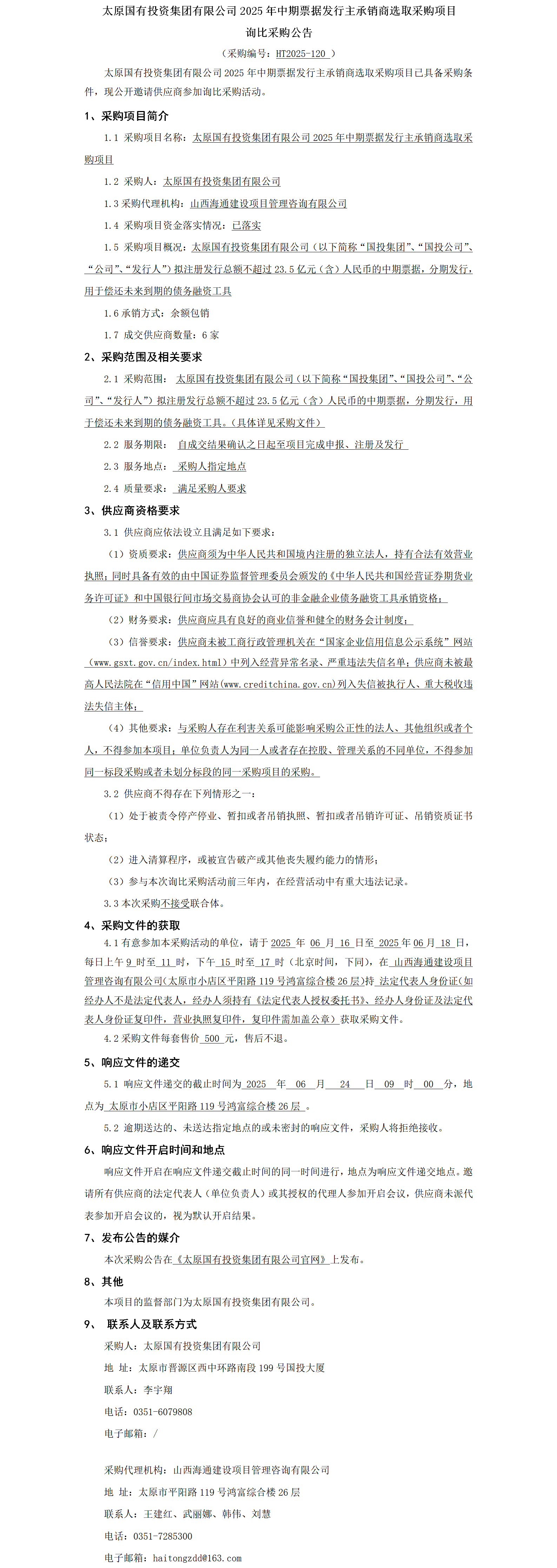 太原國有投資集團(tuán)有限公司2025年中期票據(jù)發(fā)行主承銷商選取采購項(xiàng)目詢比采購公告