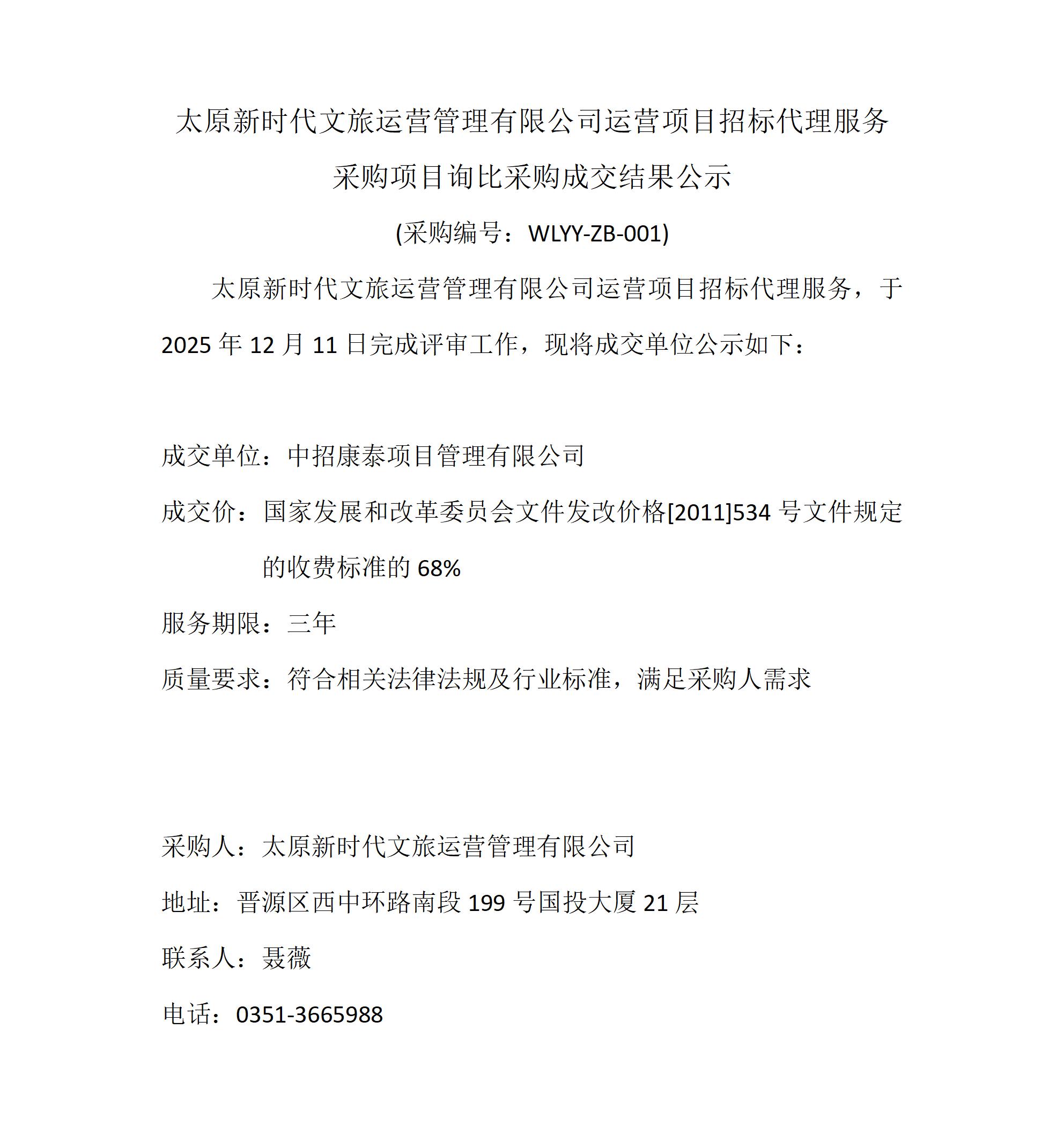 太原新時代文旅運營管理有限公司運營項目招標(biāo)代理服務(wù)采購項目詢比采購成交結(jié)果公示